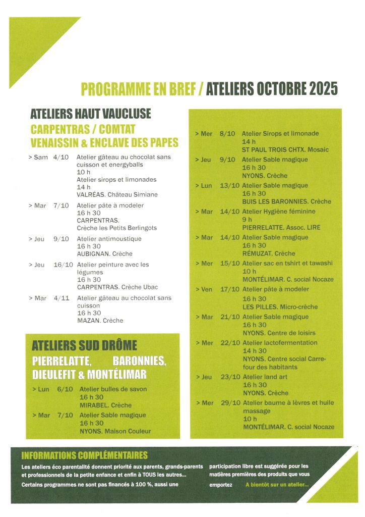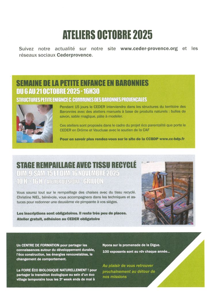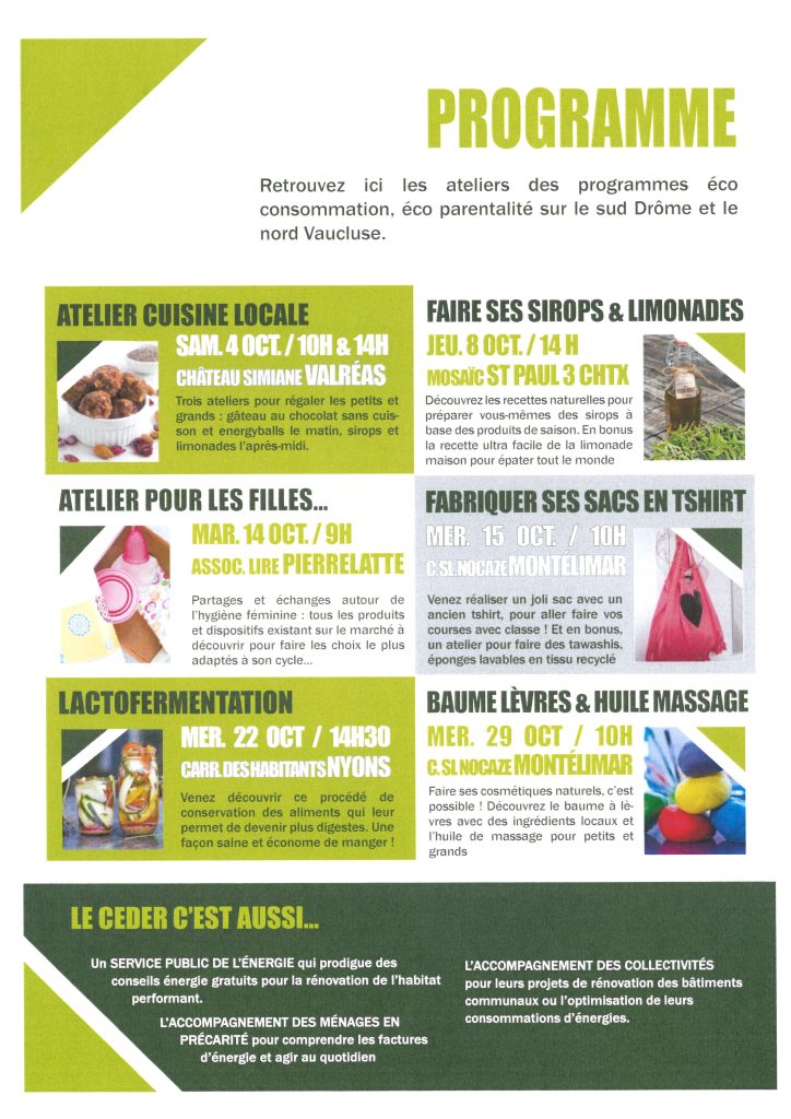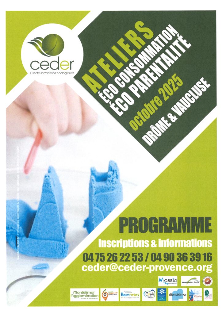 Le CEDER organise des ateliers sur l’éco consommation et l’éco parentalité, vous retrouverez le programme ci-dessous :