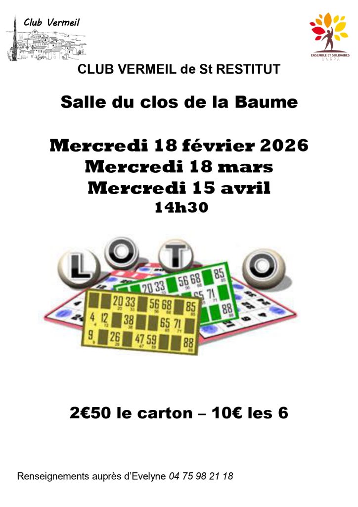 Le Club Vermeil organise comme chaque année plusieurs lotos dans la salle du Clos de la Baume, Ci-dessous les prochaines dates :