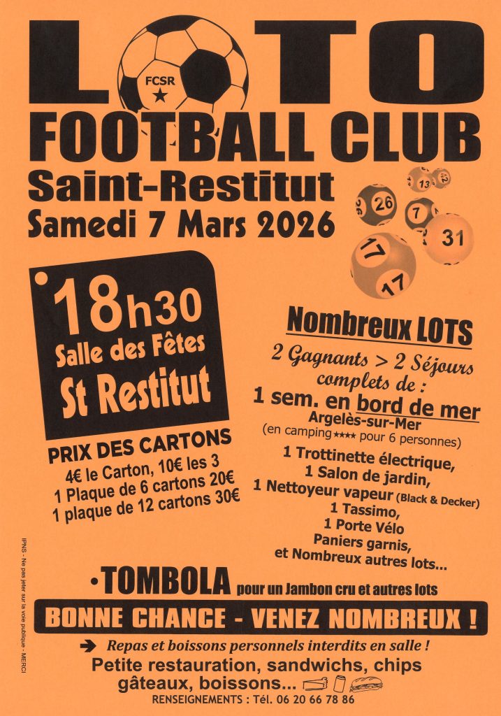 Le samedi 7 mars 2026, le football club de Saint-Restitut organise un loto, plus d’informations ci-dessous :