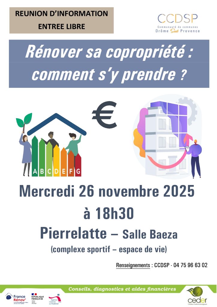 La communauté de communes Drôme Sud Provence, en partenariat avec l’association CEDER, organise une réunion publique d’information destinée à tous les propriétaires en copropriété :